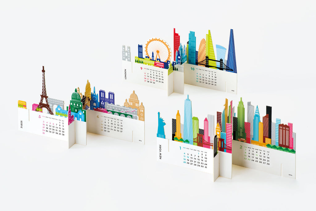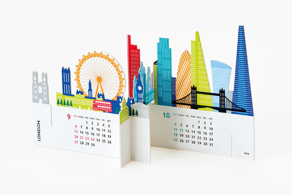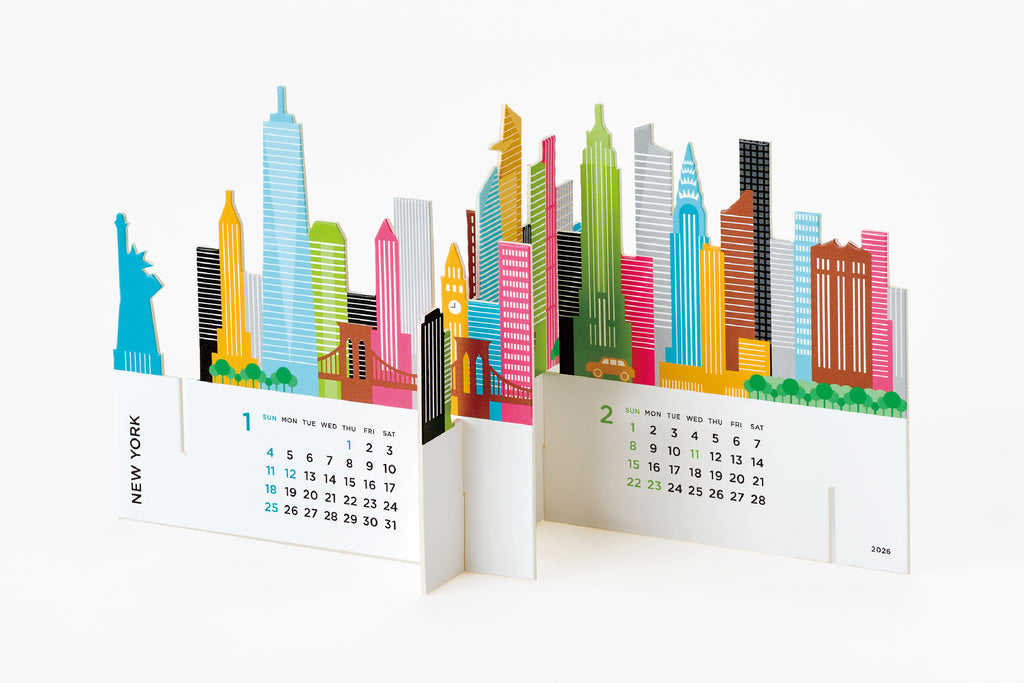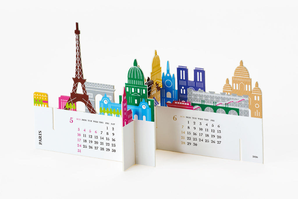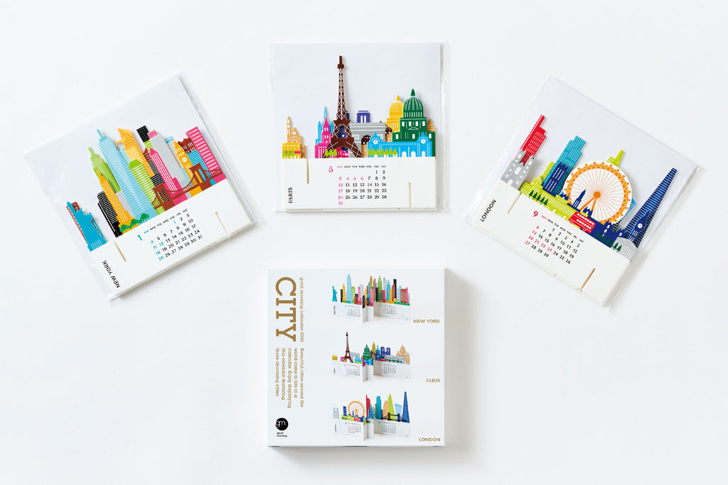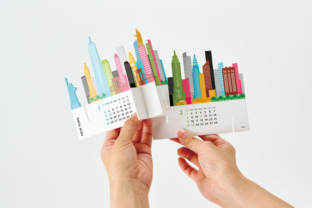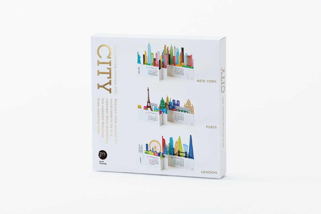 good morningCITYは、世界の都市をモチーフにしたカレンダーです。パーツを組み立てると、ランドマークが立ち並ぶカラフルな都市が完成します。2026年はNew York、 Paris、Londonの3都市がセットされています。
