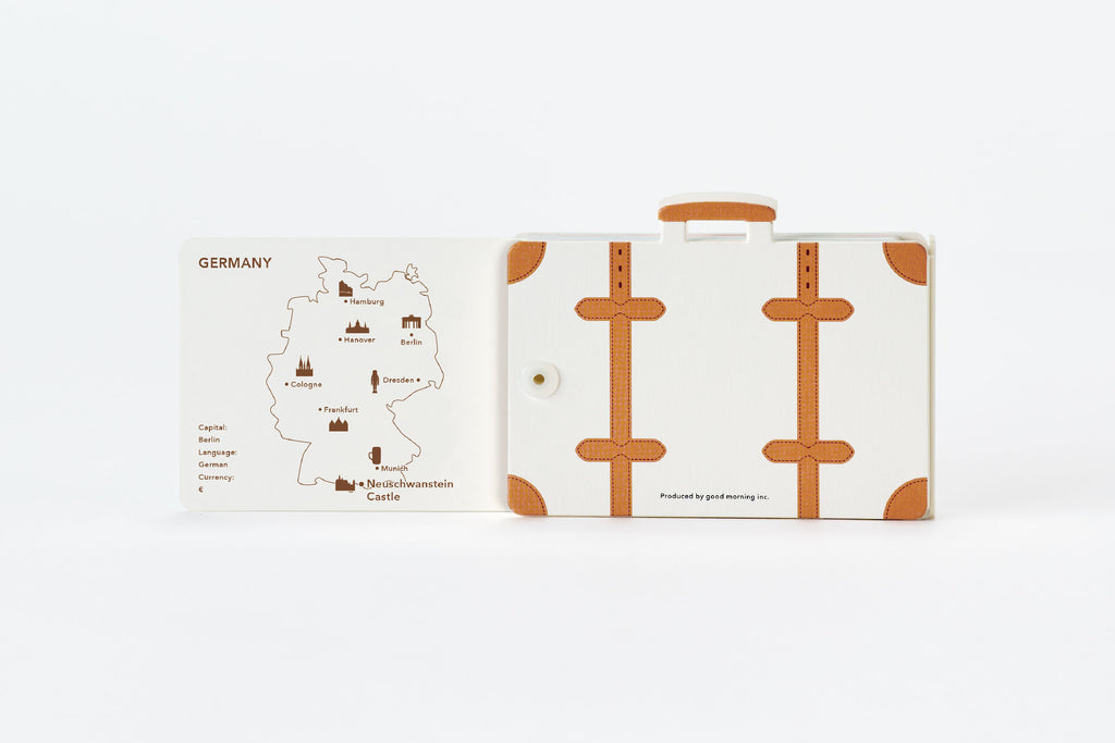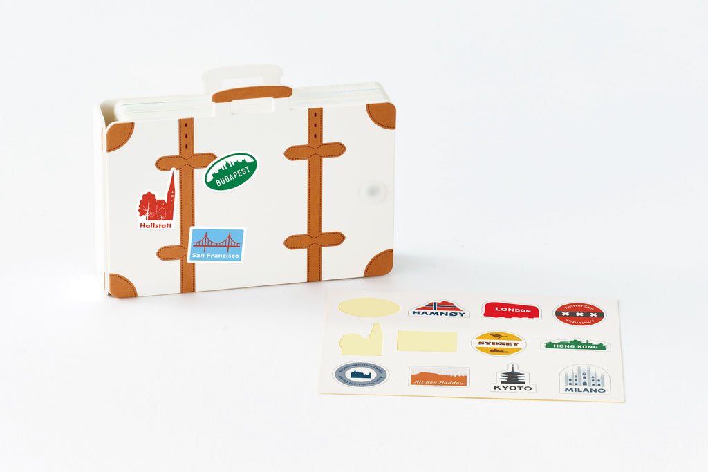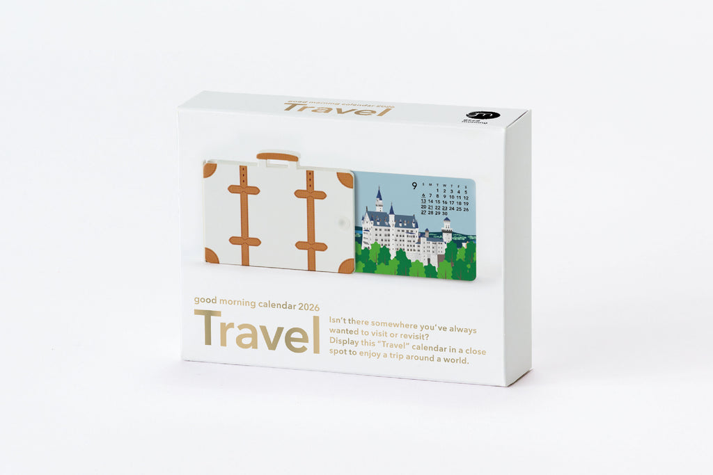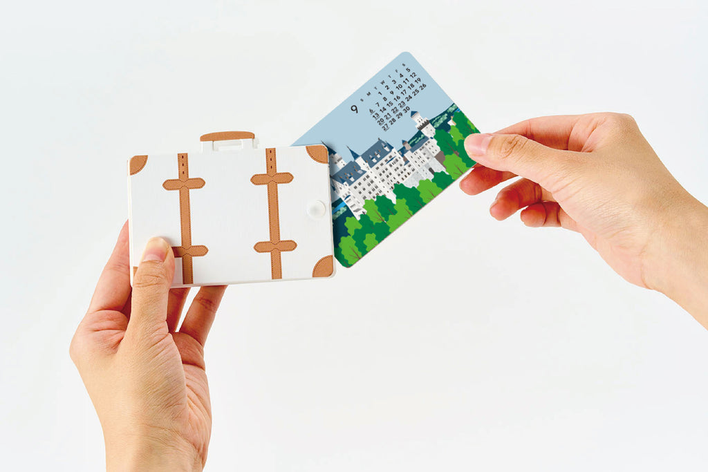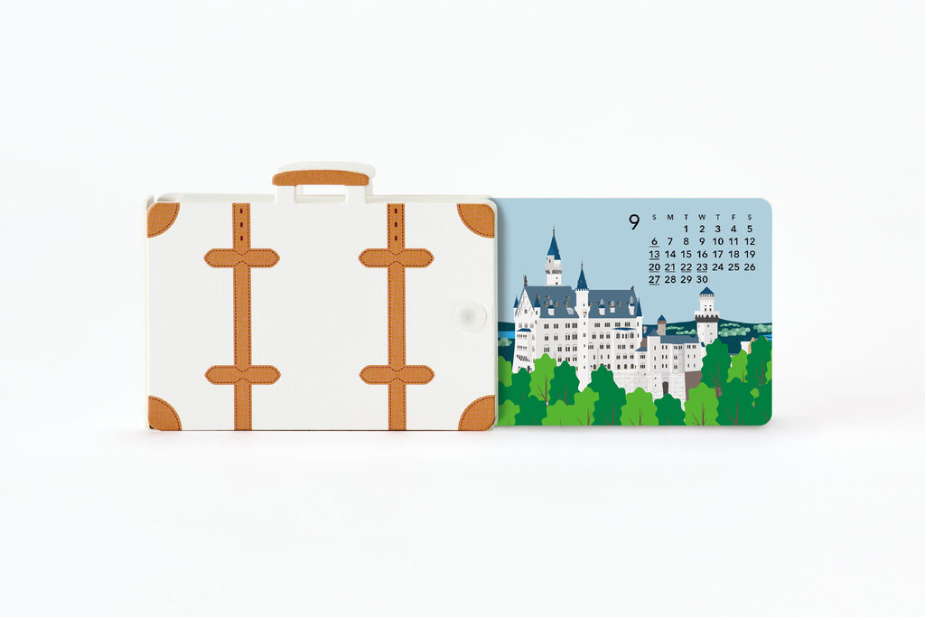 Travelは、世界旅行をテーマにしたカレンダーです。トランクの中に収められている、表に風景画、裏に地図が描かれたシートを回転させて使います。1年をかけて世界の都市や絶景をめぐる旅をお楽しみください